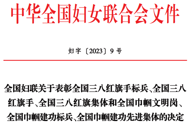 近日,中华全国妇女联合会印发《全国妇联关于表彰全国三八红旗手标兵、全国三八红旗手、全国三八红旗集体和全国巾帼文明岗、全国巾帼建功标兵、全国巾帼建功先进集体的决定》(妇字〔2023〕9号),jdb电子控股集团办公室行政部上榜,获评“全国巾帼文明岗”。